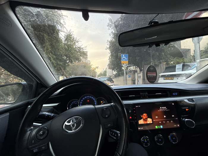 The image depicts the interior of a Toyota vehicle, observed from the driver's perspective, looking through a somewhat smudged front windshield onto an urban street scene. The steering wheel, prominently featuring the Toyota logo, dominates the lower-left foreground. The vehicle's instrument cluster displays an illuminated red warning light. An aftermarket infotainment system is visible in the center dashboard, presenting a media player with an image of a man with a mustache and Hebrew text, including "פזמון" (Chorus) and "שינוי, לטובה" (Change, for the better). A digital clock on the dashboard reads 16:10. An oval-shaped air freshener, branded with the Toyota logo and bearing Hebrew text for "Toyota Authorized Service," hangs from the rearview mirror. The external environment is consistent with a street in Tel Aviv, Israel. This is confirmed by the presence of Hebrew text on a blue disabled parking sign (featuring a white wheelchair symbol) on the right side of the road, and an Israeli license plate (partially visible as 730-XX-102) on a parked white SUV. Numerous trees line the street, with buildings visible in the background. The sky appears overcast or at dusk.
