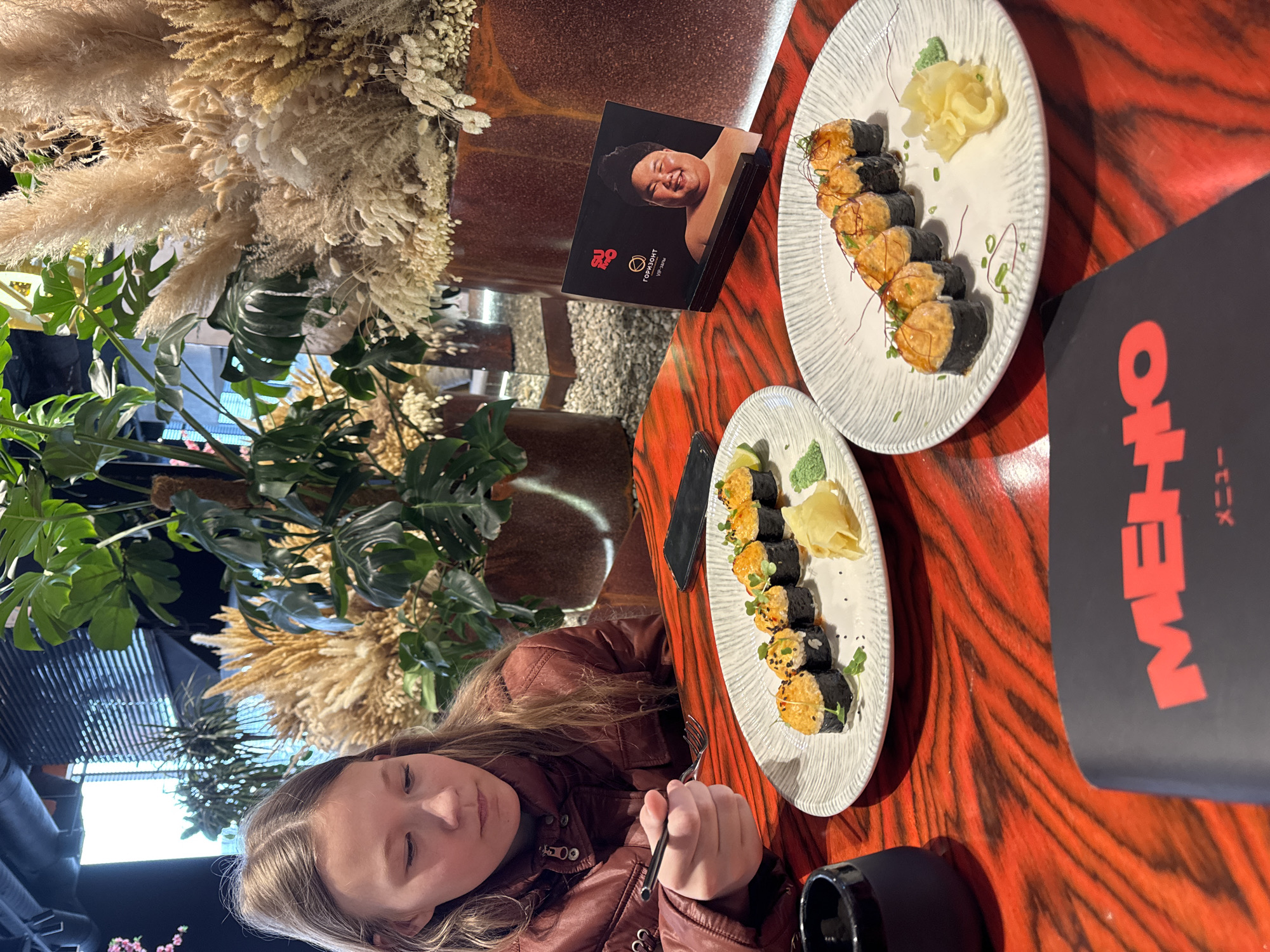 A young girl sits at a red-toned wooden table in a restaurant. She is wearing a brown leather jacket and holding a fork in her right hand. Two plates of sushi are visible on the table, each topped with ginger and sprouts. A black menu with red text is positioned on the table. To the left, a potted plant with large green leaves and dried pampas grass partially obscures the view of the windows in the background. A business card with a picture of a sumo wrestler is also visible on the table. The location is a restaurant in Aksay, Russia.