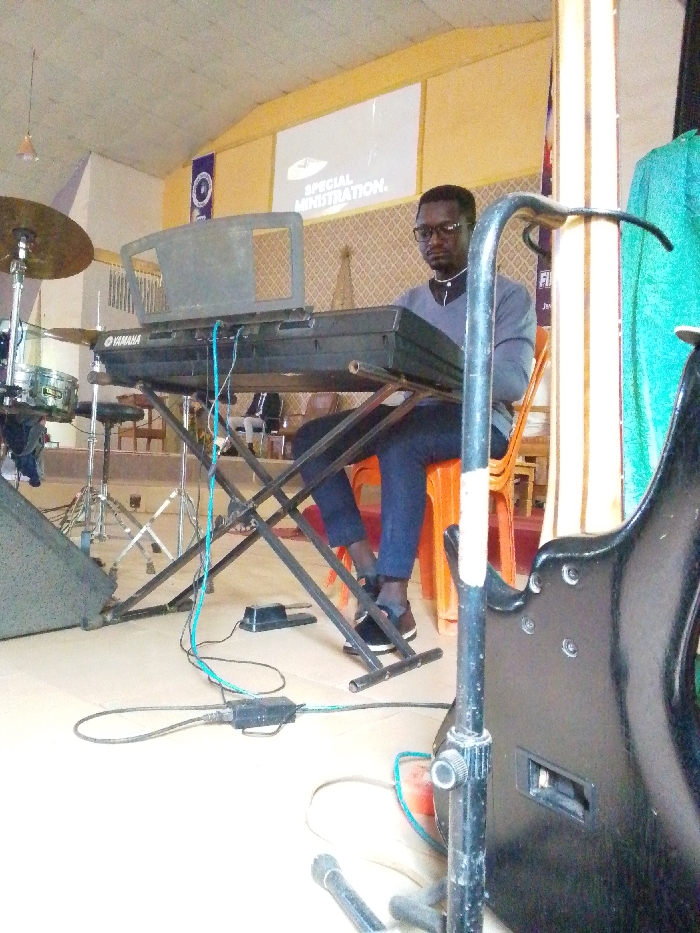 An indoor scene depicts a musical performance or assembly setup. A dark-skinned male, wearing glasses, a grey long-sleeved collared shirt, dark trousers, and black shoes, is seated on an orange plastic chair behind a black Yamaha keyboard, which rests on a black X-style stand. His hands are positioned over the keyboard. To the left, a partial drum set, including cymbals and a snare drum, is visible. In the right foreground, a black electric guitar or bass guitar body is partially obscured by a black metal stand. Multiple audio cables (blue and black) are visible on the light-colored floor, connecting to a black foot pedal and a small black junction box. A microphone lies on the floor in the lower right. The background features light-colored walls with yellow trim and a white projection screen displaying "SPECIAL MINISTRATION." A blue banner with a white circular logo is affixed to the wall to the left of the screen. Additional orange plastic chairs are visible further back. The location is an indoor assembly hall or performance venue within the city of Unknown, Unknown.
