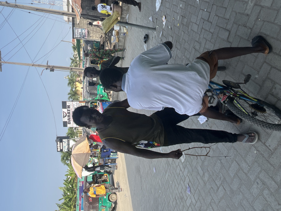Two men stand on a paved street next to a bicycle. The man closer to the camera wears a green shirt and black pants, holding a thin branch. Another man, facing away, wears a white shirt and shorts and appears to be sitting on the bicycle. Behind them, a street scene includes utility poles, buildings, signs, and multiple auto rickshaws. The lighting suggests it is daytime.