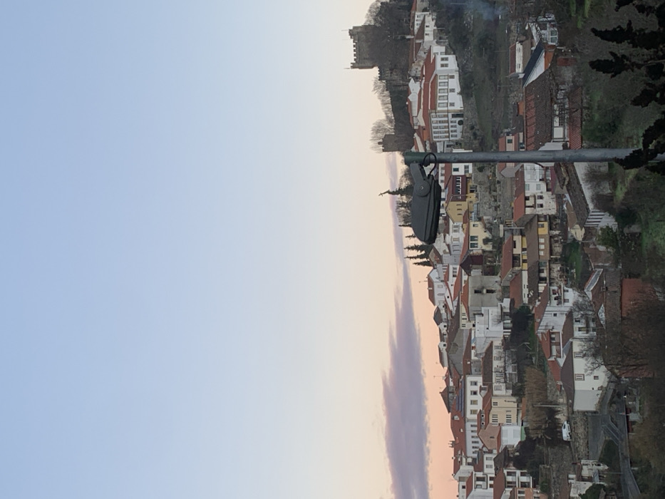 A sideways view features a European town beneath a pale sky. Tiled roofs and white facades define the architecture. A castle structure looms atop a hill in the background. A street light obscures part of the scenery, and some greenery is visible. The photo appears to be taken at dusk or dawn given the sky's soft gradient.