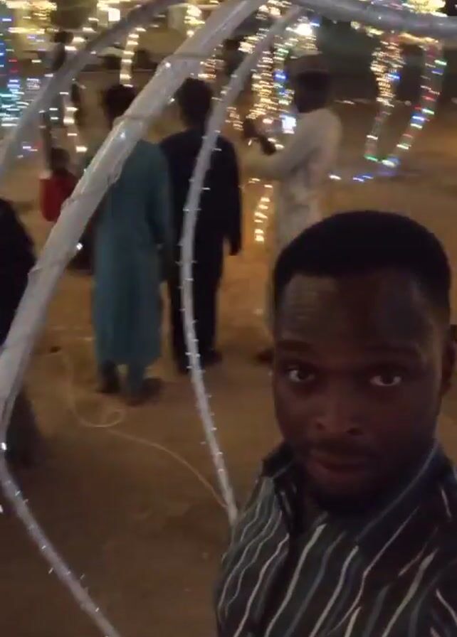 A man takes a selfie in a public space with other people walking around in the background. He is wearing a striped shirt. A decorative structure made of white frames adorned with white lights is partially visible in the foreground, framing the selfie. The background is filled with more decorative lights, possibly strung between structures or trees. Other people are visible in the background, walking around and wearing various types of clothing. The ground appears to be dirt or sand.