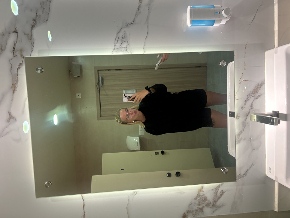 The image displays a mirror selfie captured within a modern public restroom in Malé, Maldives