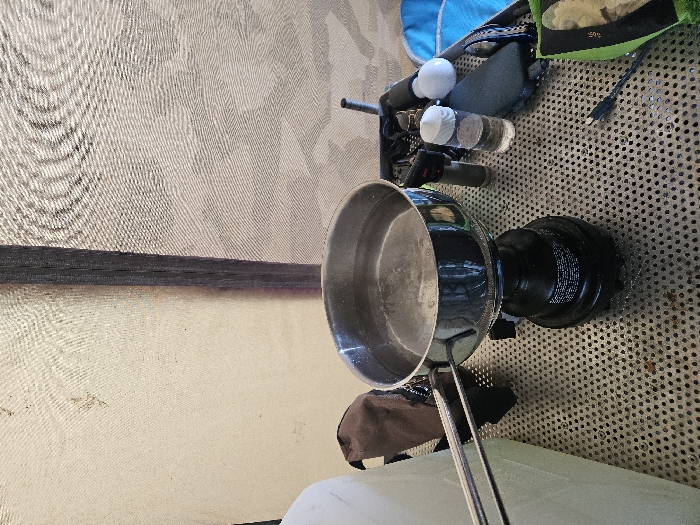 The scene depicts a temporary cooking arrangement inside a tent or similar shelter located in Gavisse, France. A silver-colored stainless steel saucepan containing water, showing minimal surface agitation, is centrally placed on a black portable camping stove. The stove and surrounding items rest on a light-colored, perforated metal surface, likely a table or platform. To the left of the stove, a large translucent white plastic jerry can is partially visible, behind which a brown fabric bag or backpack is present. To the right of the stove, various objects are arrayed on the perforated surface: a dark cylindrical object, a clear plastic bottle filled with liquid and sealed by a white cap, a white spherical object (possibly a light source), a black rectangular pouch or case, a section of blue fabric (possibly a bag or mat), a green fabric pouch, and a black cable terminating in a USB-type connector. The background consists of light-colored, possibly mesh, fabric walls of the enclosure. No individuals are present.