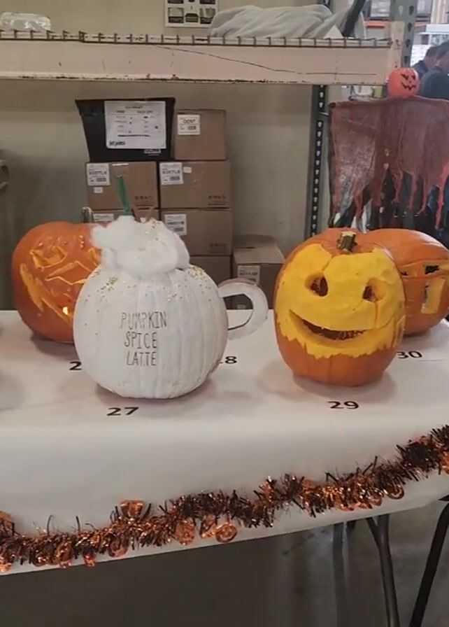 A table covered in a white tablecloth displays several Halloween pumpkins. The table is decorated with orange and black garland. The pumpkins are carved with various designs, including faces, a cat, and a pumpkin spice latte. Numbers are placed in front of each pumpkin. Shelves full of boxes are in the background. Two people are visible in the background.
