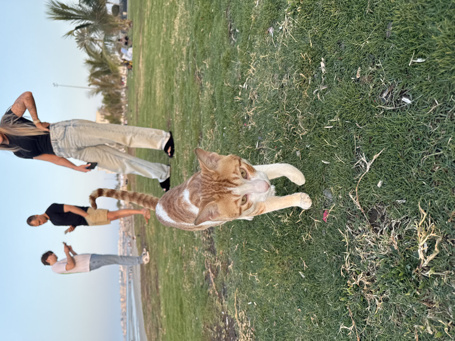 An orange and white tabby cat, with a raised tail, walks towards the viewer on a patch of green grass in Bawshar Province, Oman. The cat has orange stripes and patches on a white base, and its eyes are focused forward. In the midground, three individuals are visible. To the left, a male in a white t-shirt, light blue jeans, and white sneakers is looking at a mobile phone. Next to him, a second male in a black t-shirt and light brown shorts is also observing a mobile phone. To the right, a female in a black short-sleeved top, light blue wide-leg jeans, and black open-toed sandals stands with her right hand on her hip and a mobile phone in her left hand, revealing tattoos on her right arm. Behind these individuals, a sandy beach and the ocean are visible, bordered by a coastline with buildings. Further to the right in the background, palm trees and other individuals are present in a park-like setting. The sky is clear and light blue, indicating daylight conditions.