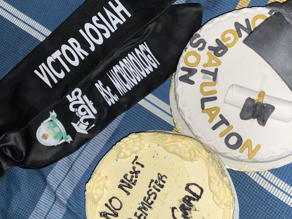 Two cakes and a graduation sash lie on a blue and white striped surface. One cake, with white frosting, reads "No Next Semester Grad" in black icing. The other, also white, says "Congrats Son" in black and gold with a fondant graduation scroll. The black graduation sash features "Victor Josiah" and "BSc. Microbiology" in white letters, along with the Kaduna State University logo and "Camp 26". All items suggest a graduation celebration.