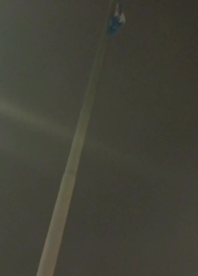 A video shows a street light post, filmed from a low angle. The post is tall and straight, painted in a light color. At the top is the light fixture, appearing as a small object with blue elements. The background is a hazy or dark sky, with a few streaks of light. The recording appears to be taken during nighttime.