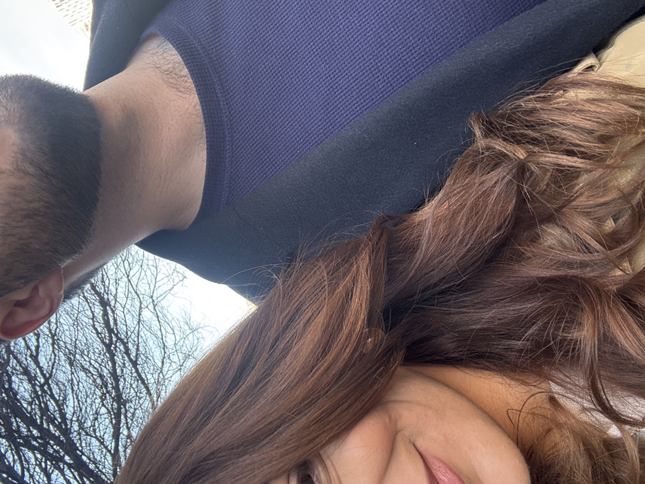 The image depicts a close-up, outdoor portrait of two individuals. A woman's partial face, including her left eye, cheek, and smiling lips, occupies the lower left of the frame. She has long, wavy reddish-brown hair. A man's partial face, featuring a trimmed dark beard, jawline, and visible ear, is visible on the right, along with his neck and upper chest. He wears a navy blue waffle-knit shirt beneath a dark overcoat. The background shows numerous bare tree branches against a clear, bright blue sky, indicating an outdoor setting under natural daylight, likely during a colder season. The scene is located in the city of Yerevan, Armenia.