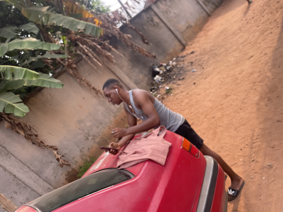 The scene depicts an outdoor environment in Onitsha, Nigeria, characterized by an unpaved, reddish-brown earthen ground. A male subject, appearing to be a young adult, stands leaning against the rear left quarter panel of a red sedan. He is wearing a grey tank top, dark shorts, and black Adidas slide sandals. His hair is cut short. He holds a dark-colored smartphone in his left hand, with a white earbud visible in his right ear, suggesting he is using wired headphones. His right hand is raised near his ear, possibly adjusting the earbud or interacting with the phone. A light brown garment is draped over the trunk or rear panel of the red car, which features a light-colored bumper. In the background, a concrete wall, likely weathered and light brown, is visible. Above the wall, green banana leaves and dried brown plant fronds are present. To the right of the subject, a small accumulation of refuse or debris is scattered on the ground near the base of the wall. The lighting suggests natural daylight.