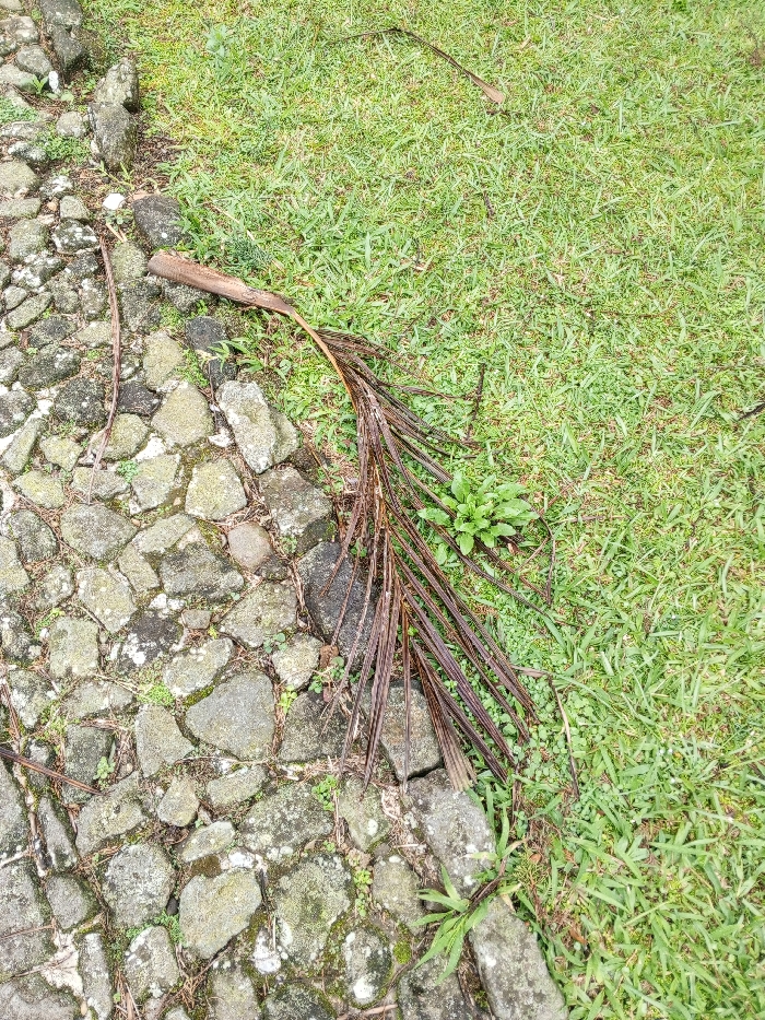 A brown palm frond lies on a border, spanning from a stone path to green grass