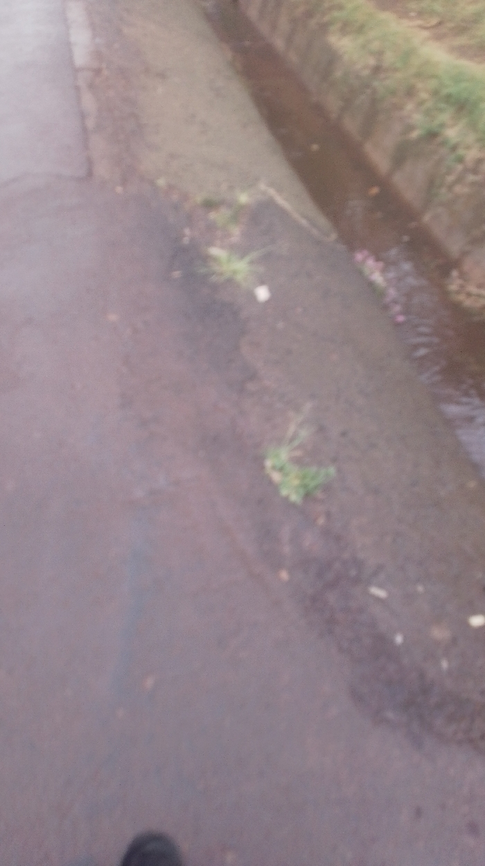 A blurred image shows a wet, asphalt road surface in the foreground. Adjacent to the road, a concrete curb separates the pavement from a narrow drainage ditch with water. Sparse green vegetation grows along the edge of the curb. The overall scene appears to be outdoors.