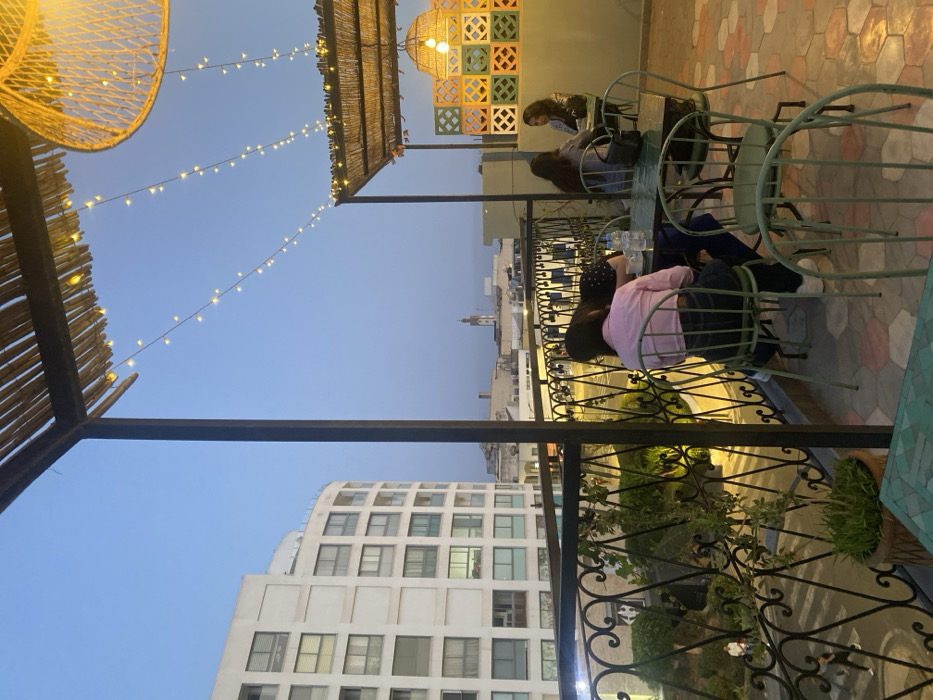 n outdoor rooftop patio with a view of the city of Agadir, Morocco, located at coordinates 30