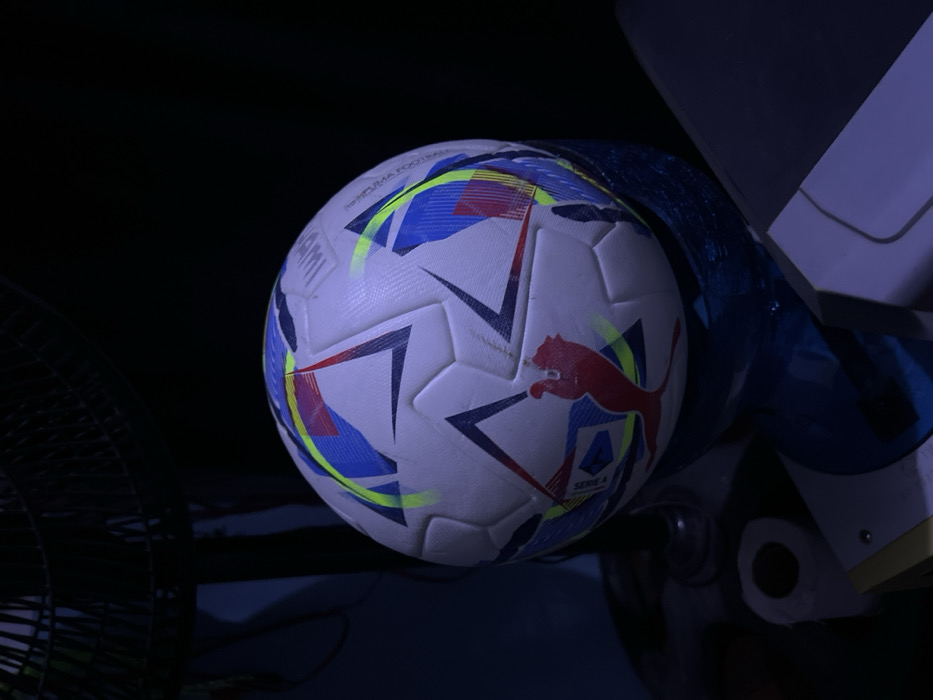 A white soccer ball with blue, yellow, and red accents features a red Puma logo and "Serie A" branding. It appears partially obscured by a blue mesh material and a white and blue object to the right. The background is predominantly dark. A dark, partially visible fan is in the lower left corner. The lighting gives the scene a cool, somewhat muted tone.