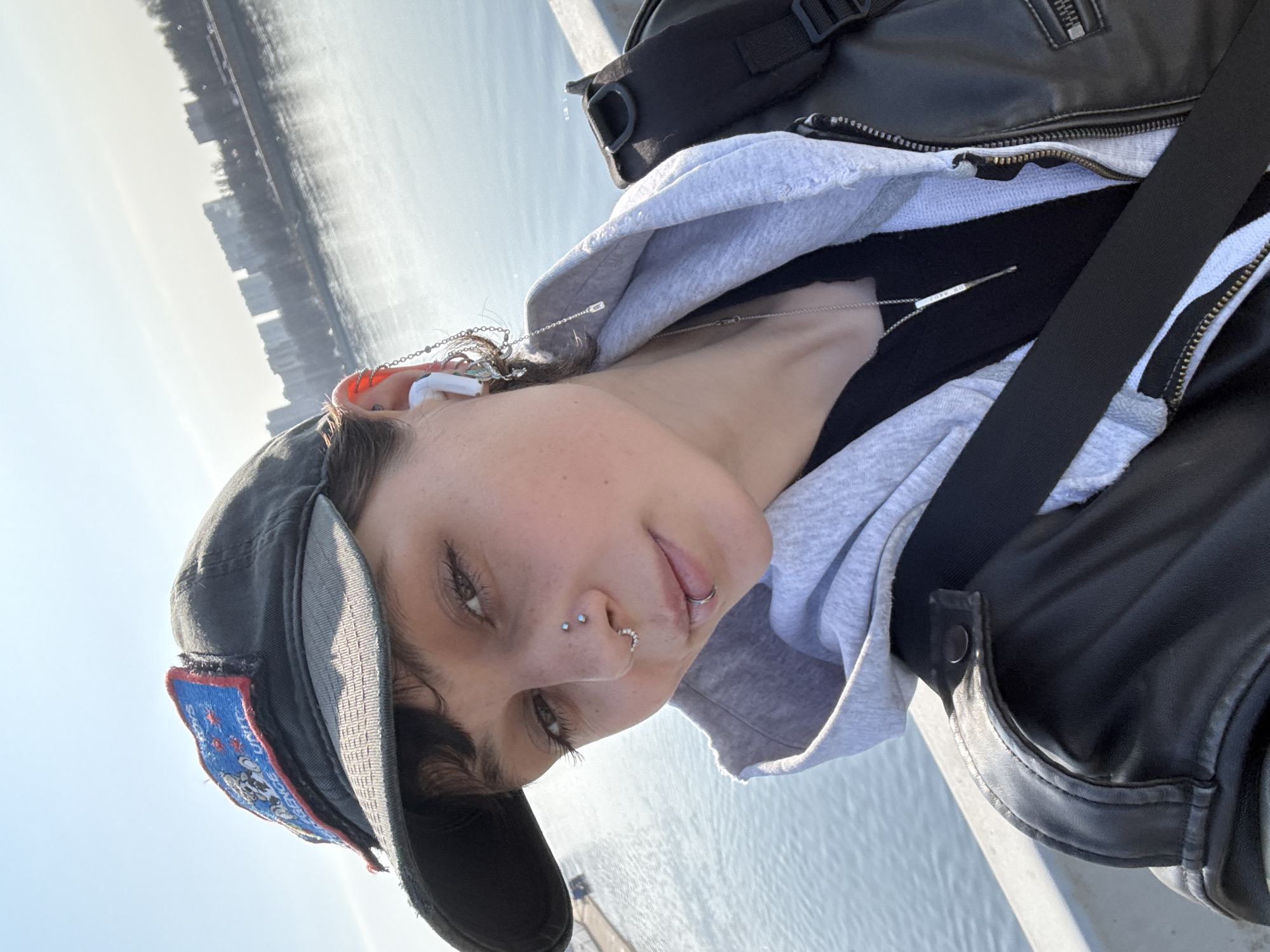 A close-up, angled, color photograph shows a person with light skin, wearing a gray hooded sweatshirt under a black leather jacket, along with a black baseball cap adorned with a patch, likely in Saint Petersburg, Russia. The person's face is visible, displaying facial piercings on the nose and lip. They are wearing earbuds. The background includes a body of water and a cityscape, possibly indicating the Neva River.