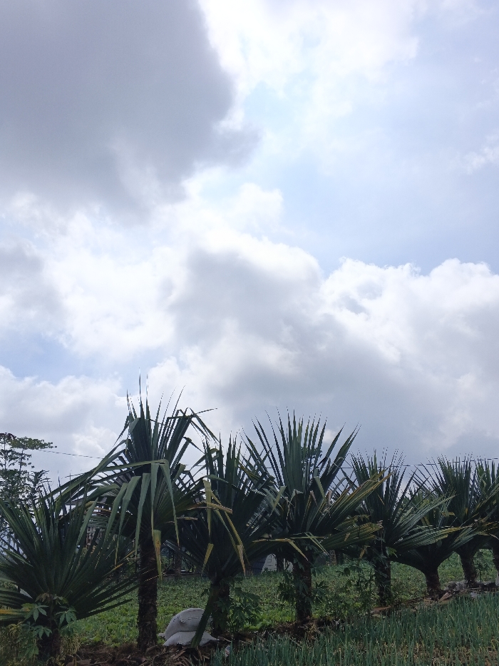 The image depicts an outdoor landscape in Kutkai, Myanmar, under a bright, partly cloudy sky. The upper two-thirds of the frame displays a sky with substantial white and grey cloud cover, illuminated by a light source positioned towards the upper right. The lower third features a foreground dominated by a linear arrangement of at least five short, palm-like plants. Each plant consists of a slender, brown trunk topped with a crown of long, spiky, dark green leaves. These plants extend diagonally across the frame from the lower left to the right. The ground in the immediate foreground, particularly on the right side, is covered in dense, short, bright green plant growth, indicative of cultivated vegetation. To the left of the central plants, a crumpled white sack or tarp is visible on the ground. Faint outlines of distant trees or vegetation are present in the far left background. No individuals or distinct urban structures are visible within the frame.
