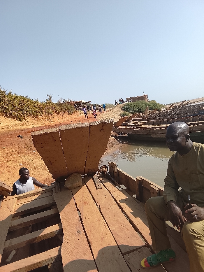 The image depicts a daytime scene in Ibi, Nigeria, at what appears to be a riverbank or construction site for wooden boats