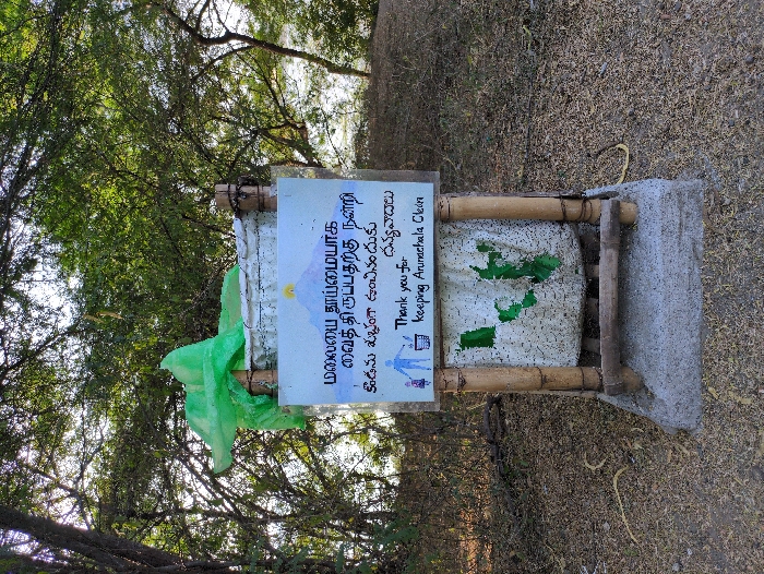 The image captures an outdoor scene in Tiruvannamalai, India, featuring a sign positioned on dry, light brown soil, likely on the path surrounding Arunachala mountain. The sign consists of a concrete base supporting a structure made of two vertical bamboo poles. These poles frame a rectangular white panel that displays text in Tamil and English, with the English portion stating: "Thank you for keeping Arunachala Clean." Below this text, a graphic depicts a stylized person placing an item into a waste bin. A small graphic of a mountain with a radiant peak is also present on the sign. A crumpled, translucent green plastic bag is draped over the top edge of the white panel, partially obscuring the upper bamboo cross-member. The ground immediately surrounding the sign is sparsely covered with scattered dry leaves and small debris. In the background, a dense growth of trees and shrubs with green foliage is visible under a clear sky.