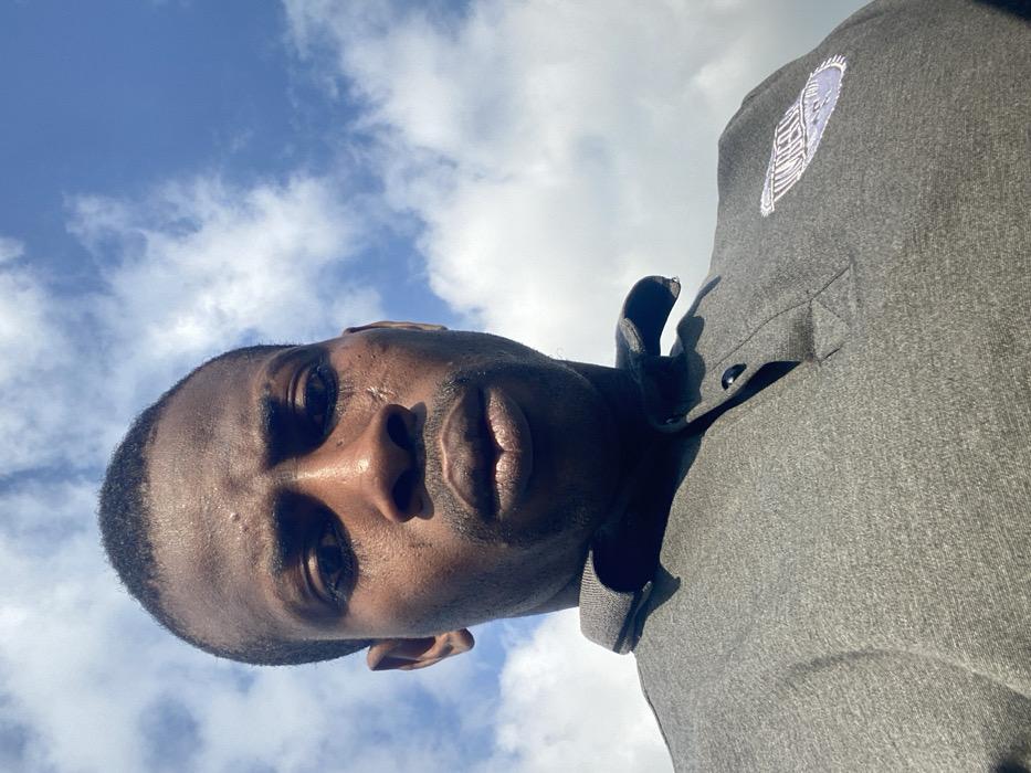 A dark-skinned adult male is depicted in a close-up, upward-angled selfie against a clear blue sky interspersed with scattered white cumulus clouds