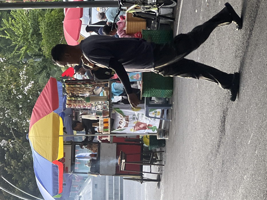A man in black clothes walks in front of street vendors. There are colorful umbrellas and various food items displayed on the carts. Other people and a bicycle are visible in the background. The scene is captured on a paved surface with some greenery in the upper left corner.