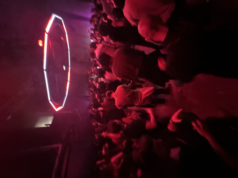 A dimly lit crowd scene with a focus on a large, illuminated octagonal structure. The crowd is dense, faces are indistinct, primarily lit with red and pink hues. The geometric structure appears to be suspended, illuminated with white and red lights. The photo is blurry and captures a concert or a performance-like atmosphere.