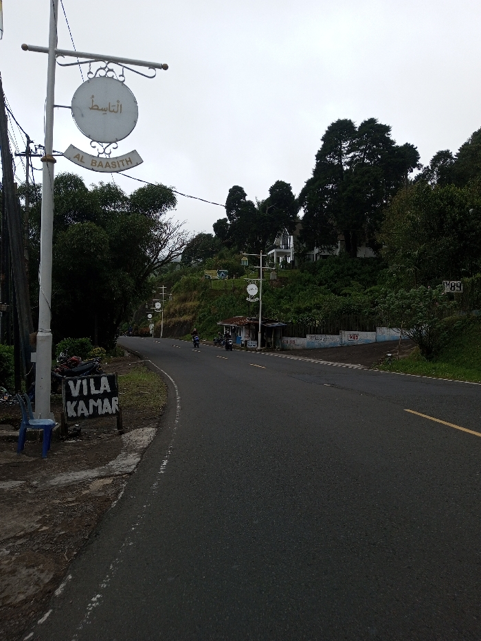 The scene depicts a winding asphalt road cutting through a lush, hilly landscape under an overcast sky, located in the city of Phoxay, Laos. In the immediate foreground on the left, a light-colored utility pole stands, from which an ornate white circular sign hangs, displaying Arabic script "الْبَاسِطُ" and the Romanized text "AL BAASITH." Adjacent to the pole, a black wooden sign with "VILA KAMAR" painted in white leans on the dirt shoulder, next to a blue plastic chair. The two-lane road features a solid yellow center line and a white dashed line marking the right shoulder as it curves uphill to the left. Along the right side of the road in the midground, a small, open-fronted roadside stall with a corrugated metal roof is visible. Two motorcycles are parked near this stall. Further down the road, another motorcycle is in motion, carrying a rider. Multiple utility poles, each adorned with similar round white signs, line the curving road. A white rectangular sign marked "KM 89" is affixed to the right embankment. The surrounding environment consists of dense green foliage, trees, and shrubs covering the steep hillsides. In the background, nestled among tall, dark green trees on the highest part of the hill, a prominent multi-story white building with a peaked roof and columns is clearly visible, along with other smaller structures.