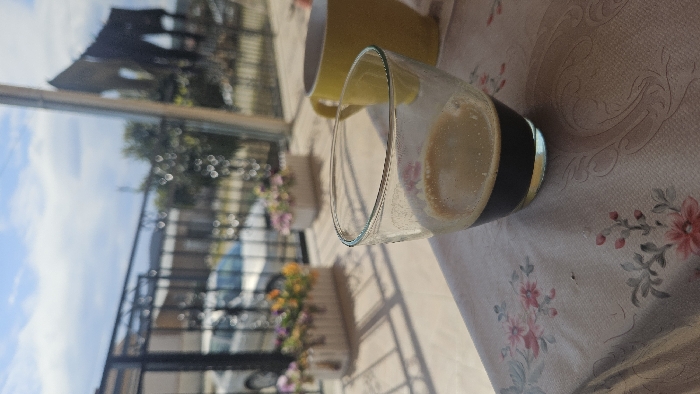 The scene depicts an outdoor setting in Negorci, North Macedonia, observed from a balcony or patio in bright daylight. In the immediate foreground, a clear glass tumbler, approximately half-filled with dark espresso topped with light brown crema, rests on a light-colored tablecloth patterned with faded pink floral motifs. To the right of the glass, a yellow ceramic mug is partially visible. Beyond the table, a dark-colored metal railing, likely part of a balcony, casts distinct shadows onto a light surface below. Two white rectangular planters, each containing various colorful flowers (yellow, pink, purple), are positioned behind the railing. In the blurred background, a light-colored vehicle, possibly silver or white, is parked. Further in the distance, indistinct buildings and green foliage are visible under a blue sky with scattered white clouds. To the far right, a dark, angular structure or object, possibly an architectural feature or laundry, stands silhouetted against the sky. No individuals are present.