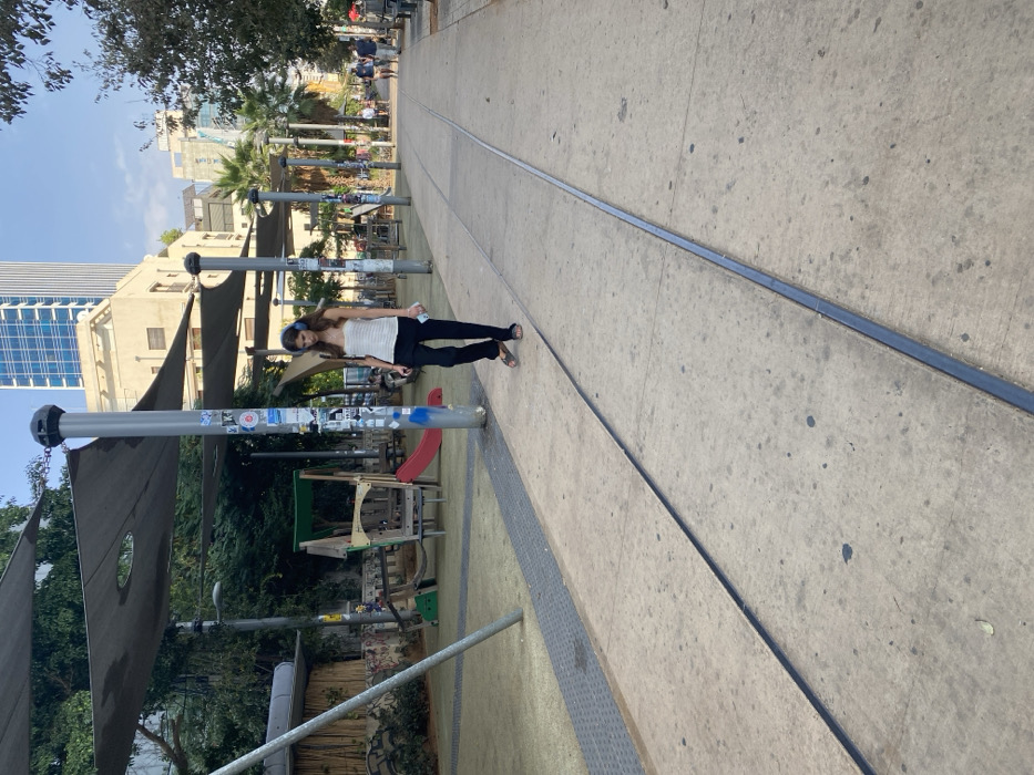 The image displays an outdoor pedestrian promenade in Tel Aviv, Israel, characterized by two parallel metal rails embedded into a light-colored concrete pathway. A young female is prominently featured in the mid-ground, walking towards the viewer. She has long brown hair, wears blue over-ear headphones, a white ribbed strapless top, black trousers, and open-toed sandals. She holds a white smartphone in her left hand, positioned low. To the left of the pathway, a public park or playground area is visible, featuring green ground cover, a red children's slide, and a wooden play structure. Dense green foliage and trees line this side of the path. Overhead, multiple dark grey rectangular shade canopies are supported by metal poles, some of which are covered with stickers. A light-colored building with a sloped roof and a textured, possibly bamboo, wall is situated behind the park area. To the right of the pathway, a line of trees, including palm trees, runs parallel, partially obscuring other urban buildings. Several indistinct human figures are visible walking further down the promenade in the distance. The background features a mix of urban architecture, including a modern, tall glass skyscraper on the left side and several older, lighter-colored buildings under a clear blue sky with minimal cloud cover.
