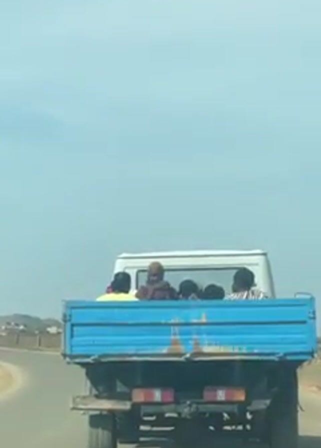 A video, shot from inside a moving vehicle, shows the back of a blue, flatbed truck. The truck is on a paved road under a blue sky, and there are several people riding in the back. The truck is slightly worn, with a white cab and a blue bed. The people in the back are somewhat indistinct, but they appear to be looking forward. The surrounding environment is somewhat barren, with sparse vegetation and a few buildings visible in the distance.