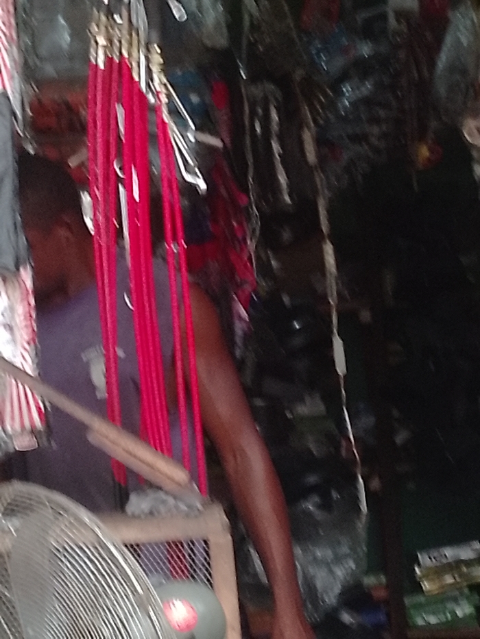 The image depicts an interior retail space in Adankolo, Nigeria. A dark-skinned individual, wearing a purple short-sleeved top, is partially visible on the left side of the frame, facing towards the right. Their face is obscured; only their torso, right arm, and the back of their head are discernible. In the lower left foreground, a silver-colored metal cage fan with a red indicator light on its base is present. Numerous red, slender objects with gold-colored tips, consistent with shisha hoses, hang vertically from above, centrally positioned and partially obscuring the individual. A wooden rod is angled diagonally from the lower left to the upper right across the midground. The background is densely packed with various merchandise, much of it appearing to be in plastic packaging, forming a dark and cluttered environment indicative of a busy shop or market stall. No specific actions or interactions are discernible beyond the individual's presence within the shop setting.
