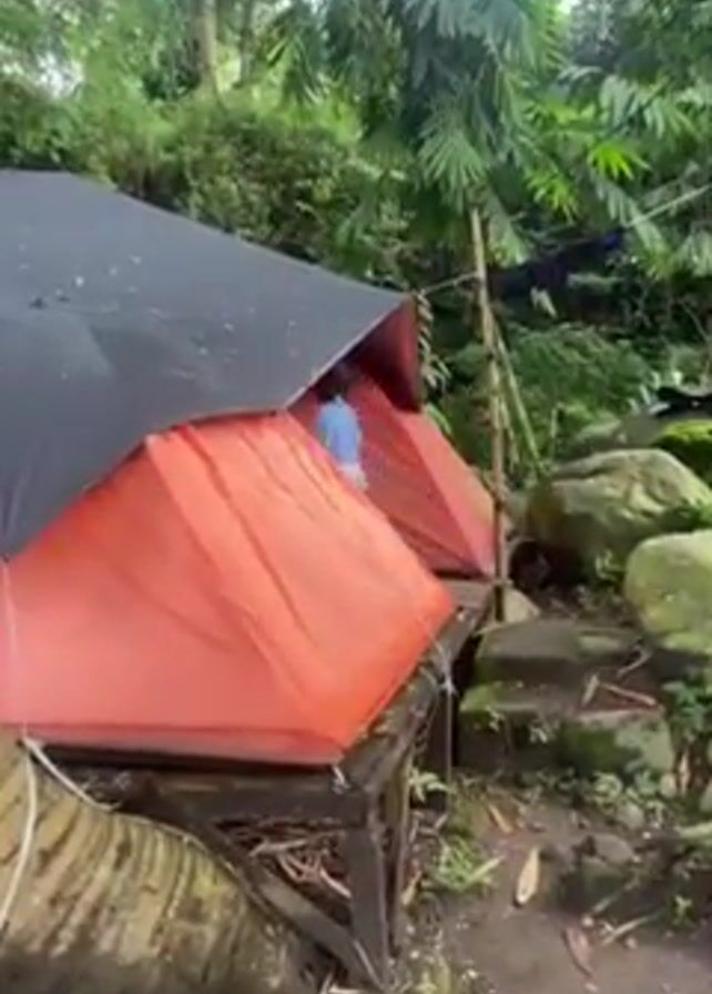 n outdoor camping scene. An orange tent with a black tarp above it is set up on a wooden platform. A young child in a light blue shirt is seen entering the tent. The tent is surrounded by lush green vegetation, including trees and bamboo. Large, moss-covered rocks are scattered around the site, and stone steps lead up to the tent platform. A clothesline with a dark-colored item hanging on it stretches behind the tent.
