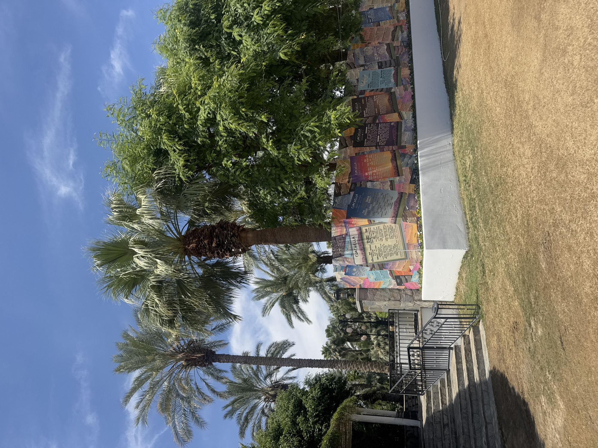 The image depicts a scene at the Coachella Music and Arts Festival grounds in Indio, California, USA. It is a sunny day with a few scattered clouds in the blue sky. In the foreground, there are several palm trees with their characteristic fronds, and behind them, a large, leafy tree partially obscures a white wall covered in vintage Coachella festival posters. To the right of the wall is a patch of dry grass. In the lower right corner, there is a set of concrete steps with a black wrought iron railing leading up from the ground level. There are no people visible in the image.