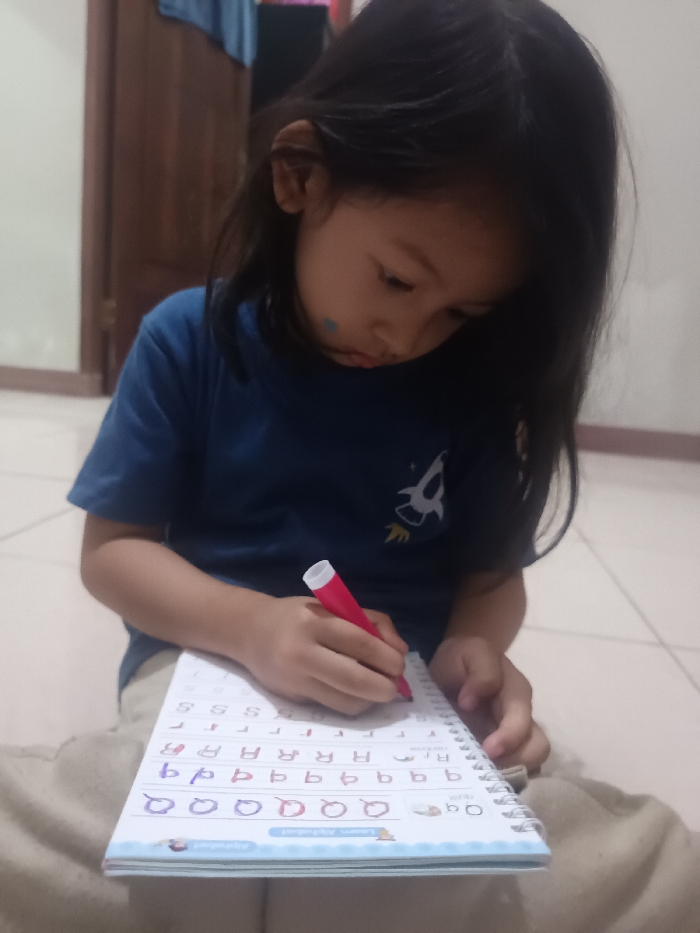 A young person, possibly a child, with long dark hair, is depicted seated on a light-colored tiled floor indoors in Maleber, Indonesia. The individual wears a dark blue short-sleeved t-shirt with a white graphic print on the front and light-colored long pants. A faint blue mark is present on the right cheek. The person is actively engaged in writing or tracing letters in an open spiral-bound workbook, holding a red marker with a white cap in their right hand. The workbook displays rows of uppercase and lowercase English letters, including 'S', 'R', 'B', and 'Q', some of which appear to have been traced. In the background, to the left, a dark brown wooden door frame and part of a door are visible, along with a piece of dark fabric hanging in the upper left. To the right, a plain light-colored wall is visible.