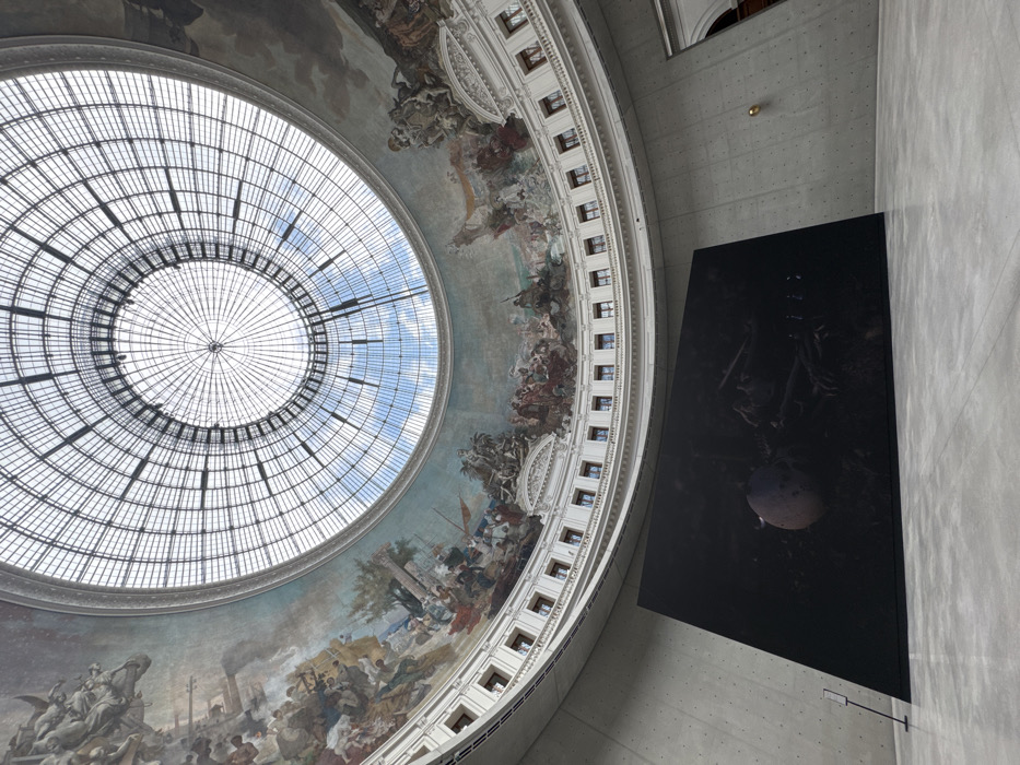 The image depicts the interior of the Bourse de Commerce – Pinault Collection, located in Paris, France. The scene captures a wide, upward view within the building's circular rotunda, showcasing both its historical architecture and a contemporary art installation. Dominating the upper portion of the frame is a vast, circular glass dome forming the ceiling, segmented by a precise grid of radial and concentric metal framing. Through the glass, a clear blue sky with scattered white clouds is visible. Immediately below the dome, a richly painted frieze encircles the upper wall. This historical mural depicts elaborate allegorical and historical scenes, featuring numerous figures, sailing ships, industrial elements like smokestacks, and diverse landscapes, rendered in faded but discernible colors. Below the frieze, a white, ornate architectural band with regularly spaced rectangular windows defines an upper gallery level. The lower portion of the rotunda features minimalist, light grey concrete walls that contrast sharply with the ornate upper sections. In the foreground, a large, rectangular digital display screen is angled and leans against the concrete wall, occupying a significant portion of the floor space. The screen exhibits a dark, dimly lit image featuring a light-colored, ovoid object, possibly a skull or egg-like form, partially obscured amidst dark, tangled organic or skeletal structures. To the immediate left of the screen, a slender, dark metal stand with a small informational plaque is present. The floor is a smooth, light grey, polished surface. No individuals are visible within the scene, and no active interactions or actions are depicted.