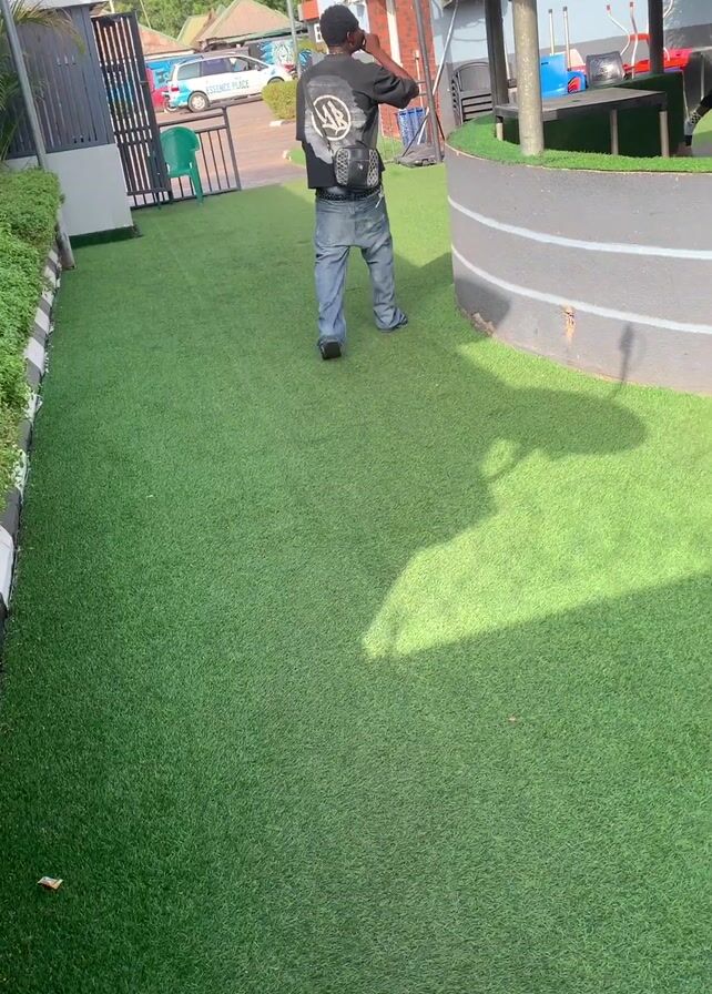 A man wearing a dark t-shirt and jeans walks on artificial green grass toward a thatched-roof gazebo