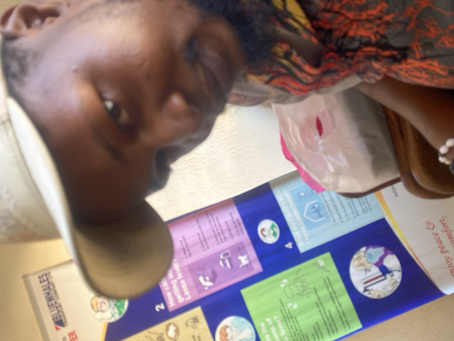 An adult male subject is depicted in a close-up, slightly upward-angled portrait, looking directly into the camera. He wears a light-colored baseball cap and a patterned shirt with orange, black, and possibly yellow elements. A white beaded bracelet is visible on his right wrist. The background features a large, vertical public health banner, predominantly blue, displaying information about Lassa fever, including sections titled "How can I avoid getting Lassa fever?" and "What do I do if I have Lassa fever?". The banner also exhibits a partial logo for "BLUEWHALES TRANSPORT COMPANY LTD" at the top left. A light-colored wall is visible behind the banner and to the right of the subject. A white plastic bag with red handles rests on a brown, possibly wooden, surface to the subject's right. The content of the banner, particularly the Lassa fever awareness, strongly suggests a location within Jos, Nigeria, likely a public health facility, clinic, or a transport-related area where such information would be disseminated.