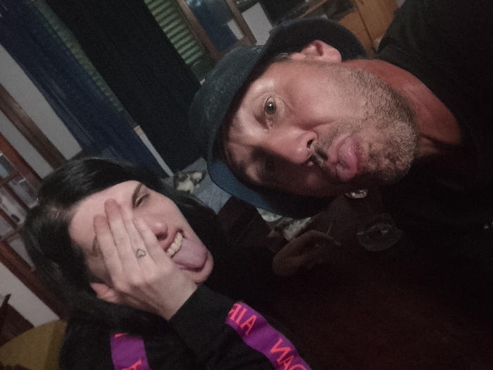 This image captures two individuals posing for a selfie in an indoor, dimly lit environment, likely a private residence, in the city of Unknown, Unknown