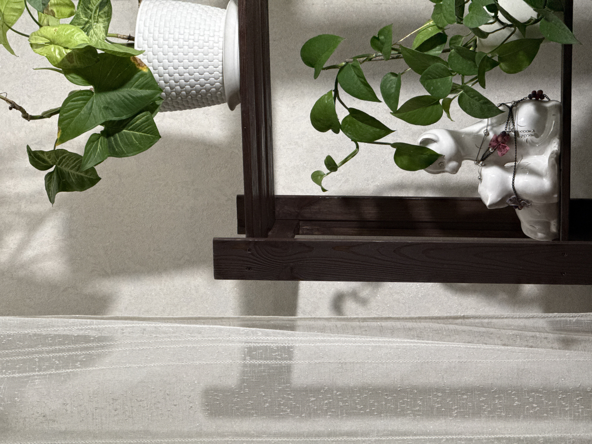 A dimly lit interior features a white textured wall with a dark wood shelf unit. A white potted plant hangs inverted from the upper left, with green leaves extending downwards. Another plant, possibly a vine, with green leaves sits on the shelf unit, draped over a white ceramic bust wearing necklaces. A white curtain is visible in the lower portion of the frame. The location of Chaikovsky, Russia is not discernible from the image.