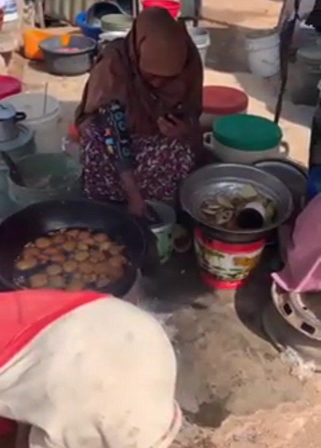 Two women are outside amidst a collection of buckets and cooking utensils. One woman, wearing a brown hijab and colorful patterned clothing, is squatting while looking at her phone. Next to her is a large frying pan filled with round, golden-brown food items cooking in oil. To the right of the pan is a metal strainer containing cooked food items. The second woman is partially visible, wearing a white head covering and patterned clothing, and is close to the camera. The ground is dirt. In the background, there are containers, buckets, and parts of what appears to be a makeshift structure.