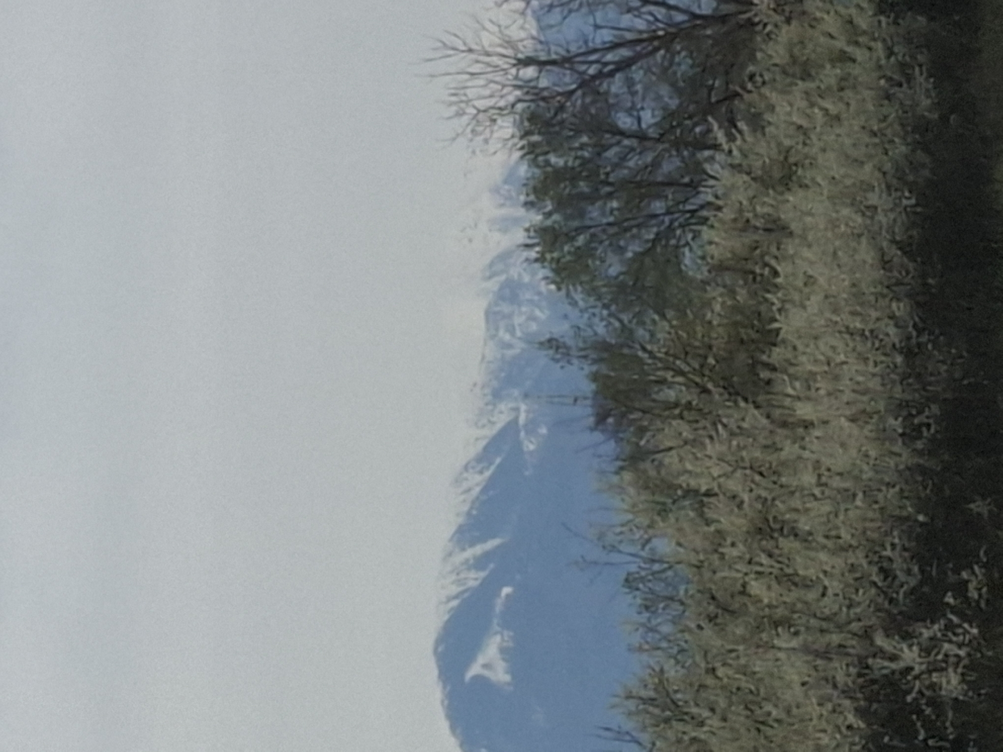 view in Borovtsi, Bulgaria, with mountains partially obscured by mist or fog on the left side of the image. Trees and vegetation are present on the right side of the image, some with bare branches, suggesting either winter or early spring. The scene appears to be from an elevated viewpoint.