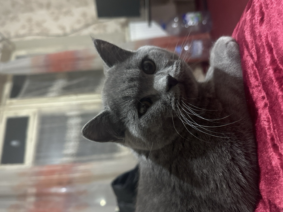 A solid grey domestic cat is depicted resting on a dark red, textured fabric surface in an indoor setting in Fergana, Uzbekistan