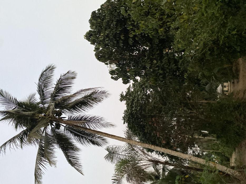 The image displays a rural landscape in Ikot Ete Ekpo, Nigeria. A tall coconut palm tree, laden with several green coconuts, stands prominently on the left, its trunk leaning rightward, and its fronds extending across the upper left sky. A narrow, light-brown dirt path, bordered by dense tropical vegetation, recedes into the background. The vegetation consists of numerous broad-leafed trees and bushes, predominantly dark green, with some lighter green and reddish-brown foliage. In the far distance, visible at the end of the path segment, is a small, light-colored, single-story structure with a dark roof. The sky is overcast, providing soft, diffused lighting to the scene. No individuals or animals are present.