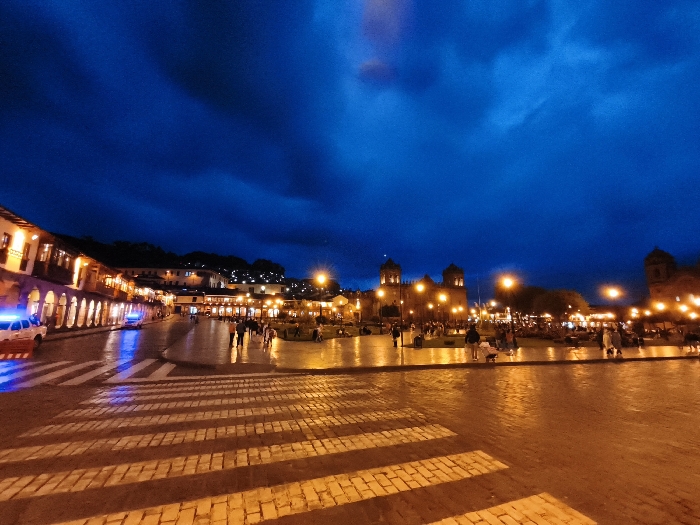 Night view of a city square, possibly in South America. The scene is illuminated by streetlights and building lights casting a warm glow on the wet pavement. People are scattered across the square. Buildings line the perimeter of the square, with a large church visible in the background. The sky is a deep blue with some cloud cover. A vehicle with flashing blue lights is parked on the left side of the square.