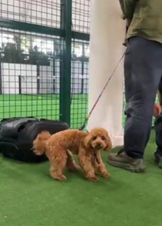 small, light-brown poodle on a colorful leash, sniffing the green surface it's standing on. The dog is next to a black bag and a person. The person is mostly out of frame, only their lower half is visible. They are wearing dark pants and olive-green sneakers. The leash is attached to the dog and held by the person. The dog is standing on a green surface resembling artificial turf. Behind the dog and person is a white cylindrical pillar and a metal wire fence. Outside the fence, there's a view of a light-green surface and a white building. A yellow tennis ball is visible on the green surface outside the fence. The setting appears to be an indoor sports facility. The camera is static.
