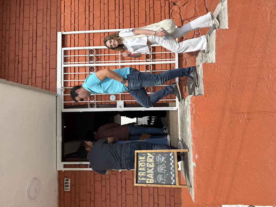 A group stands outside Frank Bakery, indicated by a chalkboard sign