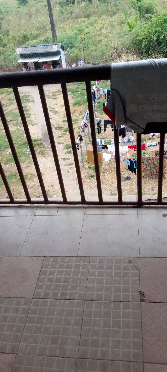 From a balcony, a view of a yard shows clotheslines laden with various garments. A path leads away from the building towards a small structure in the distance. The yard contains a mix of grass and dirt. The balcony floor features tiled patterns. A gray shirt hangs over the railing.