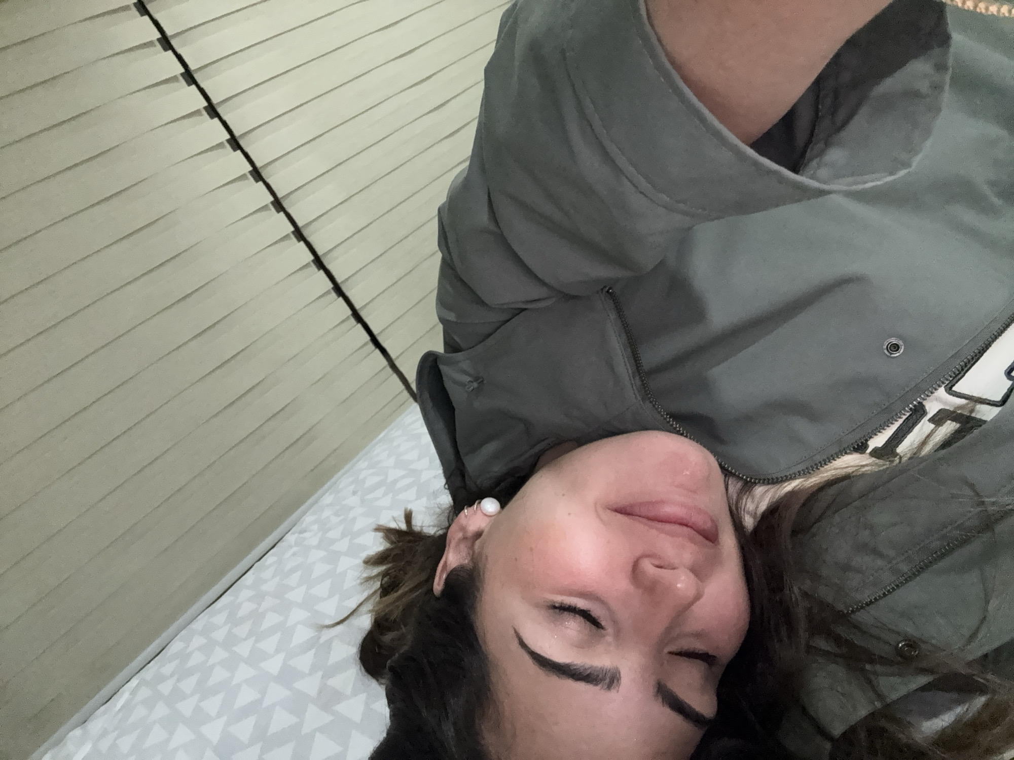 A female individual is depicted in a close-up, top-down perspective, lying on her back with her eyes closed and a subtle smile. The scene is an interior, located in Santa Clara Ocoyucan, Mexico. She is wearing a dark olive-green hooded jacket, partially unzipped, revealing a white garment with black lettering underneath. A white pearl stud earring and a small silver hoop are present on her left ear. Her dark hair is visible around her head. She rests on a bed covered with a white fitted sheet featuring a repeating light grey triangular geometric pattern. To her left, a light-colored wall is visible, characterized by horizontal slat-like structures, consistent with blinds or textured wall paneling. No other individuals are present.