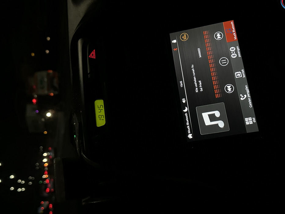 The image presents a nighttime scene observed from inside a vehicle, contextualized to be in Surabaya, Indonesia. The foreground displays a section of the car's dashboard, featuring a green digital clock that reads "19:45." To the right of the clock, a prominent red triangular button, indicative of hazard lights, is visible. Below this, a car infotainment system screen is active, showing the "Musik Bluetooth" (Bluetooth Music) interface. The screen also displays "19:45" in its upper right corner and indicates the song "Kita usahakan rumah itu" by "Sal Priadi" is currently playing, accompanied by a graphical equalizer. Interface controls for music playback (rewind, play/pause, fast forward) are present, along with menu options for "dial," "Catatan panggilan" (Call log), "kontak" (contacts), "pasangan" (pair/devices), and "Musik Bluetooth," with the latter highlighted. The background, viewed through the vehicle's windshield, is a blurred depiction of a city street or highway at night, populated by the indistinct lights of other vehicles, including multiple red taillights, white headlights, and some amber lights, suggesting traffic movement. No individuals are visible in the scene.