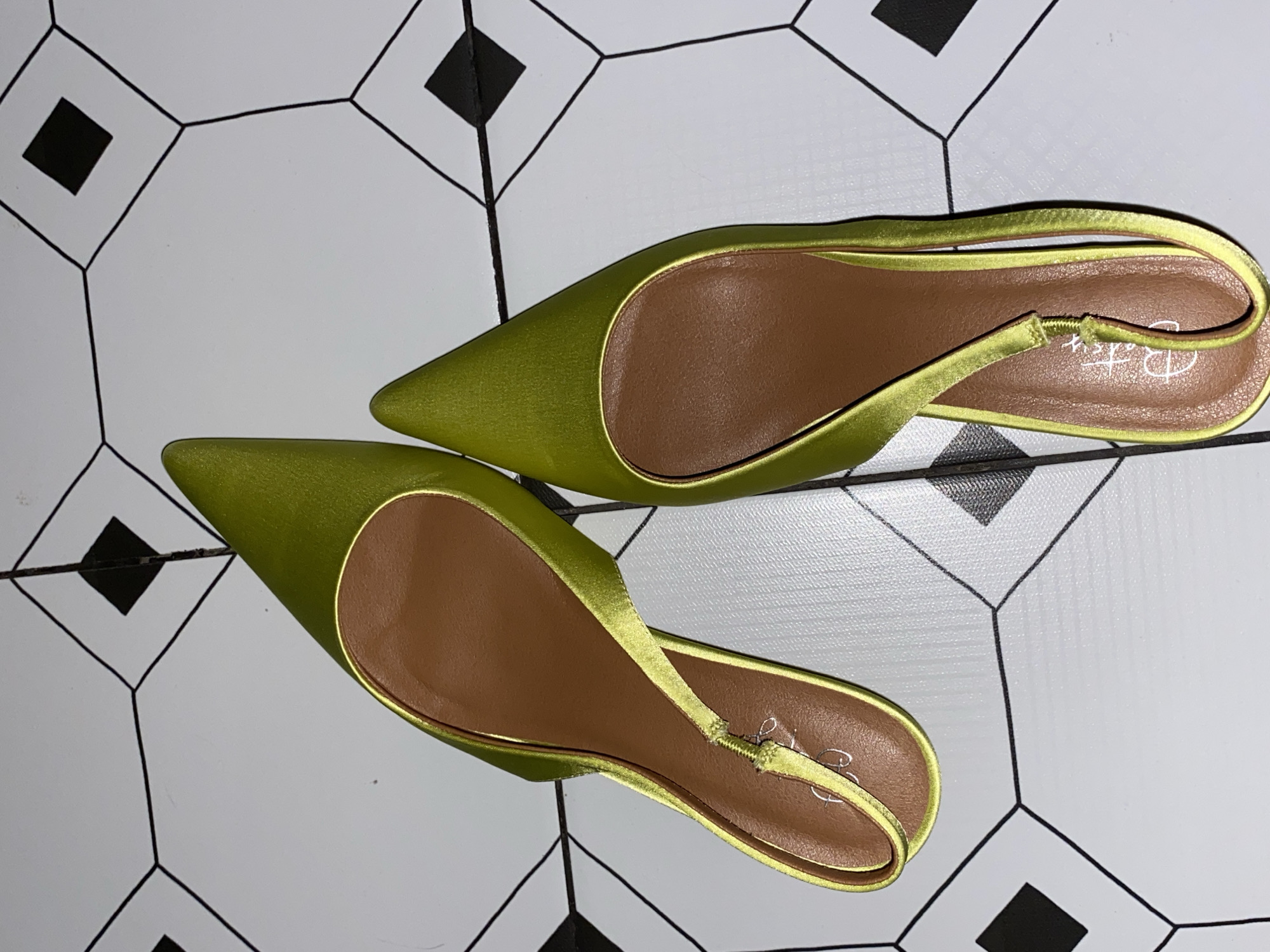 A pair of lime green satin slingback shoes with pointed toes and brown insoles rests on a tiled floor