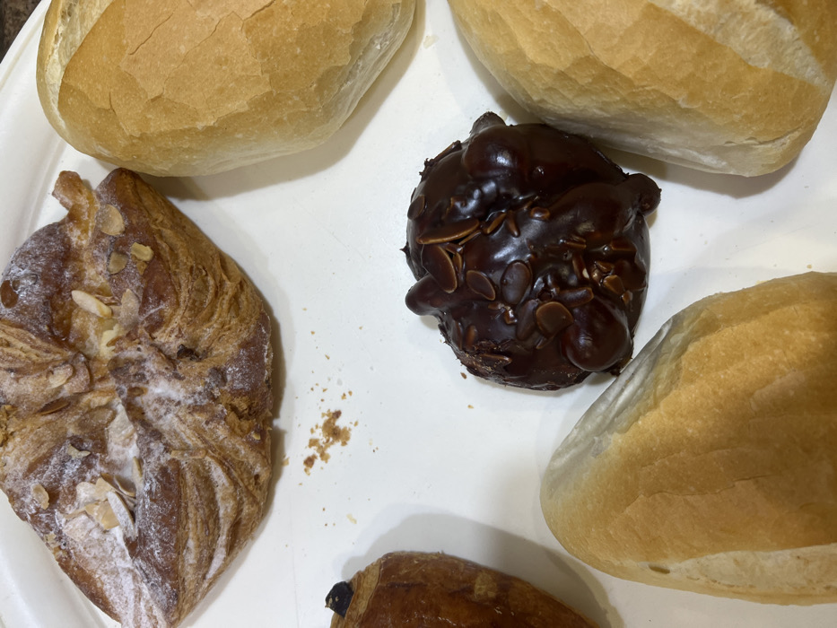 The image displays an overhead view of a static arrangement of various baked goods on a white, flat surface. In the upper portion, a golden-brown, flaky pastry, consistent with a danish, is visible, dusted with powdered sugar and garnished with sliced almonds. Crumbs from this pastry are scattered on the white surface directly below it. Towards the center-right, a dark chocolate-coated bun or pastry is present, heavily topped with sliced almonds and exhibiting an irregular, rounded form. Three light-tan, oblong bread rolls are positioned around the perimeter: one at the middle-right, one partially visible at the bottom-right, and another partially visible at the bottom-left. A smaller, dark brown pastry, featuring a dark spot on its upper surface, is partially visible at the middle-left. No individuals are depicted. This scene is located in Mexico City, Mexico.